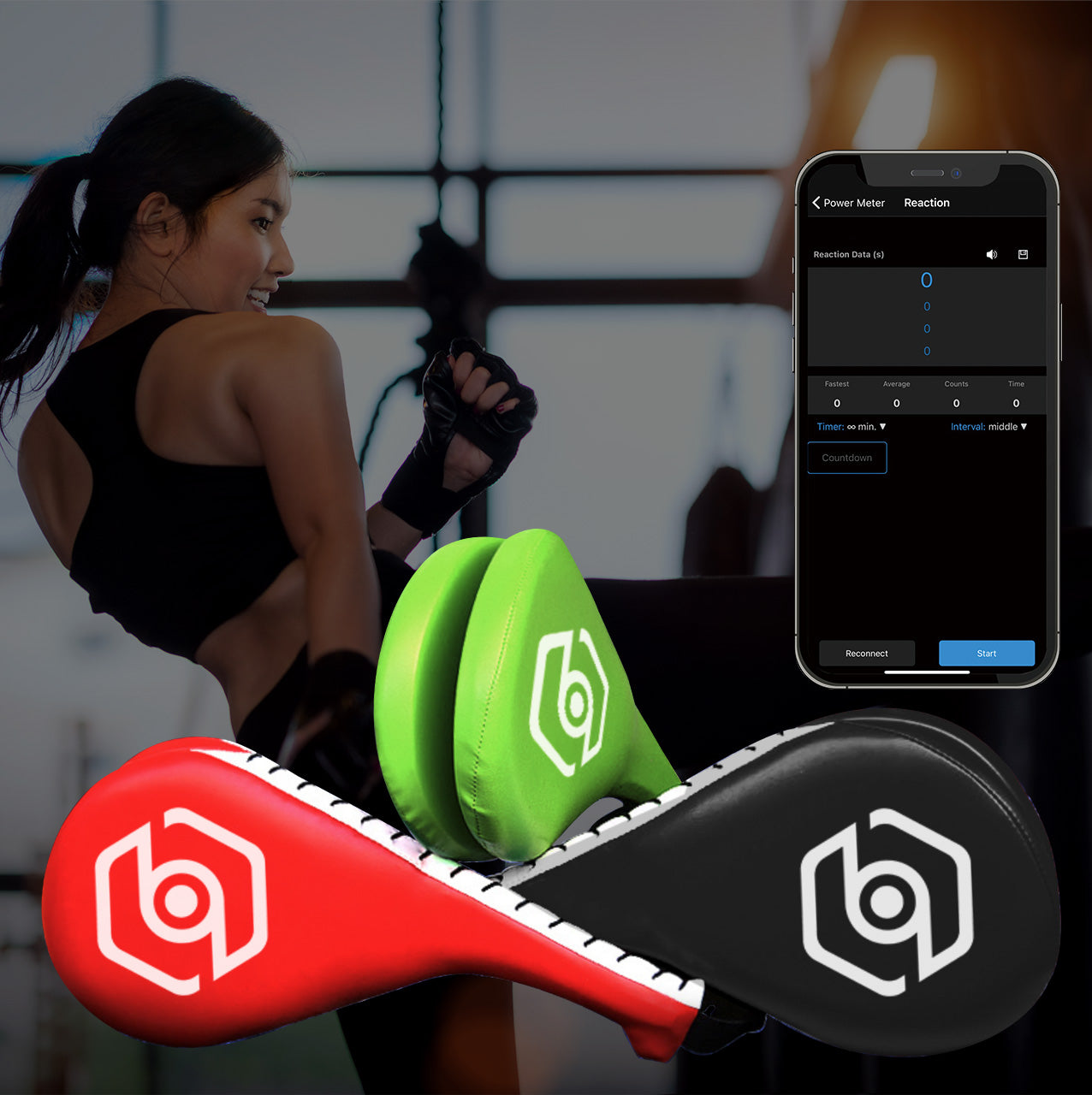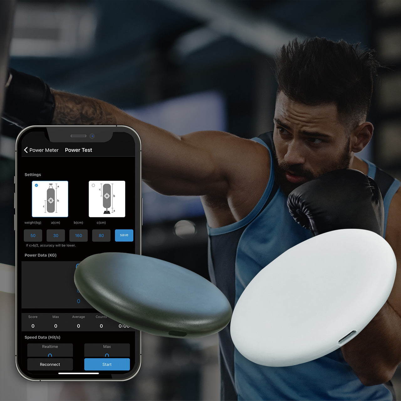 フォーストラッカーは、サンドバッグに設置し、専用のスマートフォンアプリと連携させてリアルタイムで正確なパンチ力を測定することができます。アプリには全3種類のモードがあり、パンチ力の測定の他に、反射神経や持久力を試すことができます。